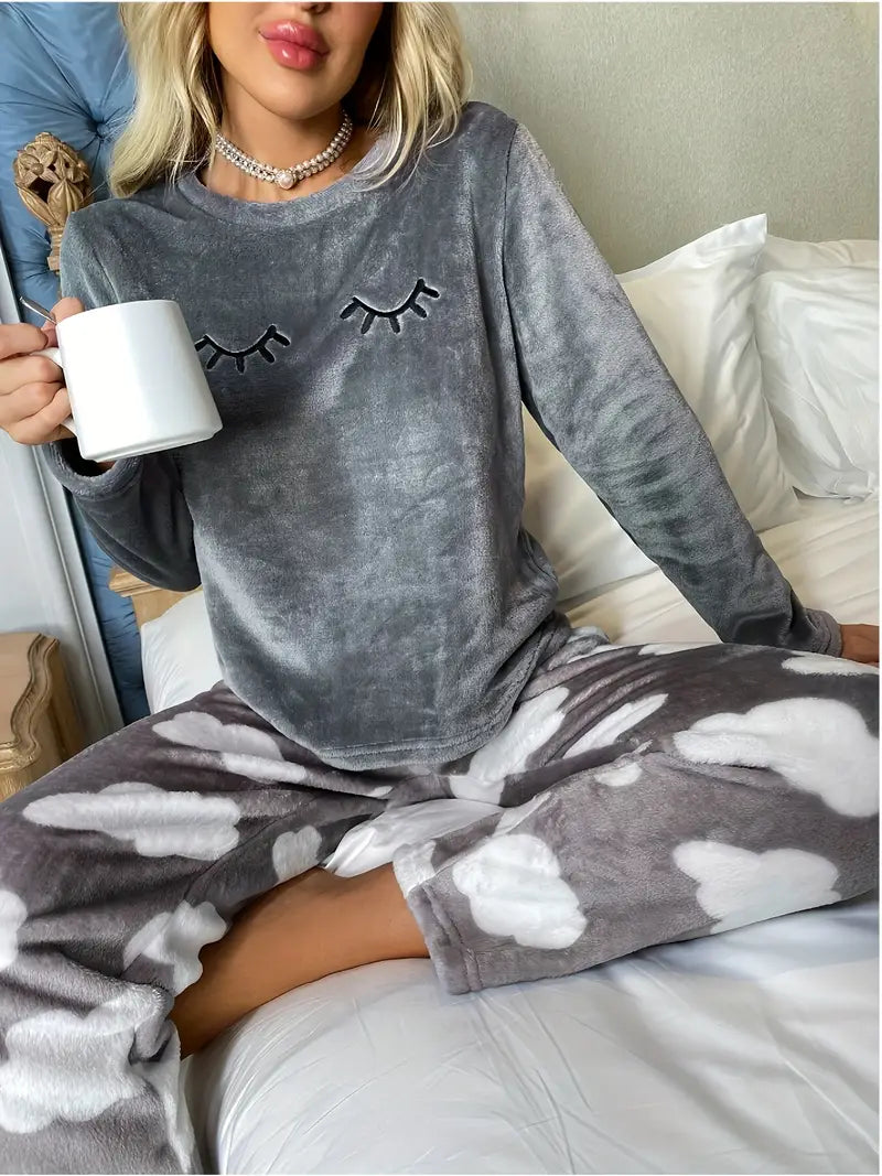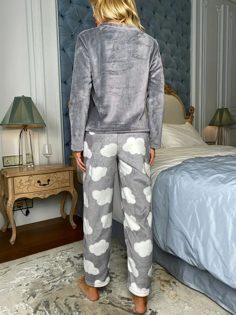 The DreamCloud Pajama Set™ features a whimsical cloud pattern that instantly lifts your spirits. The soothing shades of gray and white mimic the tranquility of a cloudy day.