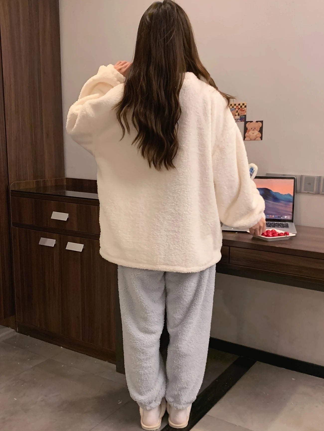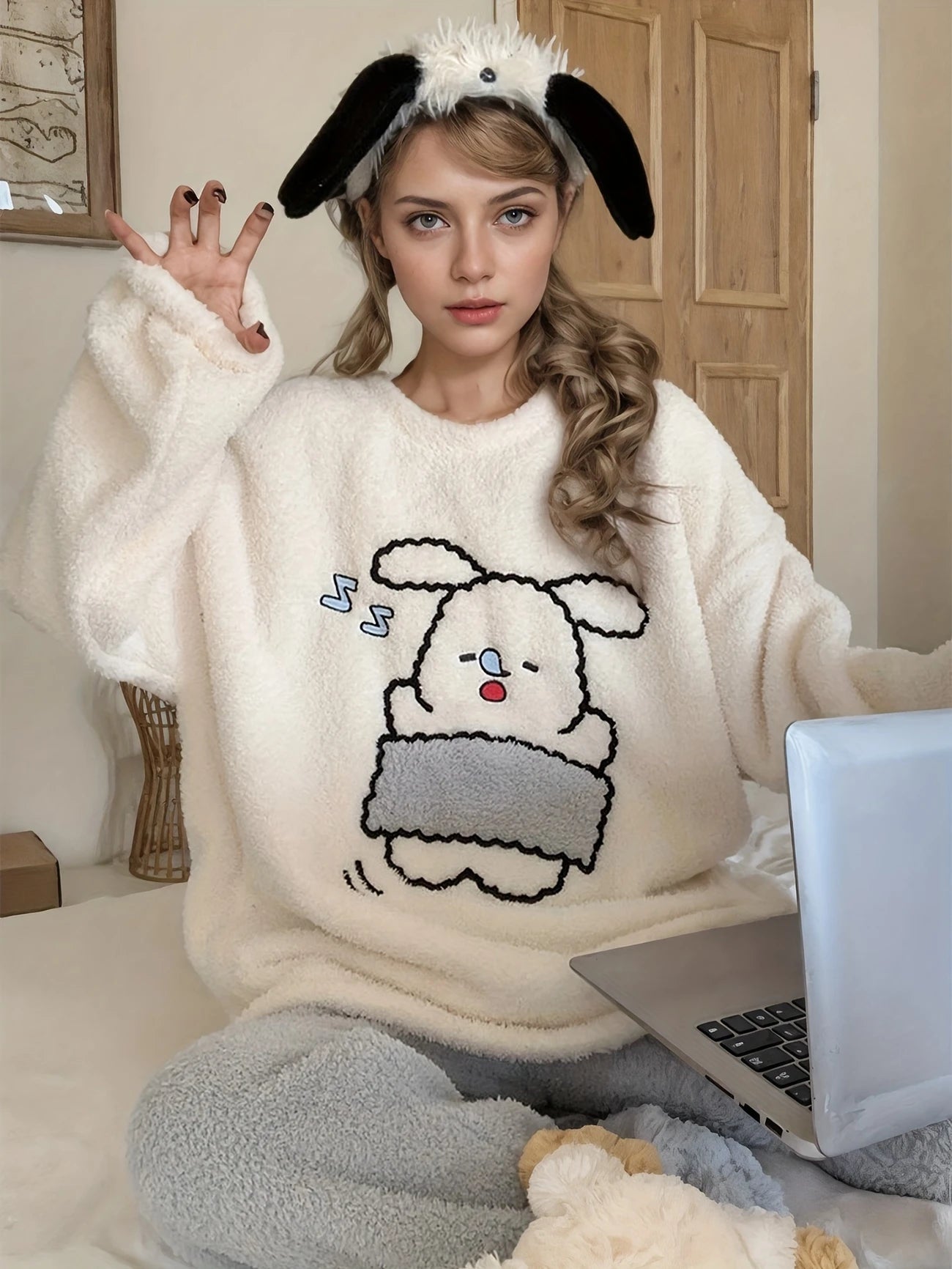 The top is slightly oversized, allowing you to move freely while still feeling wrapped in plush softness. Paired with fleece joggers that hug gently at the ankles, you get a balanced silhouette that flatters. It’s the kind of pajama set you’ll want to wear all day long.